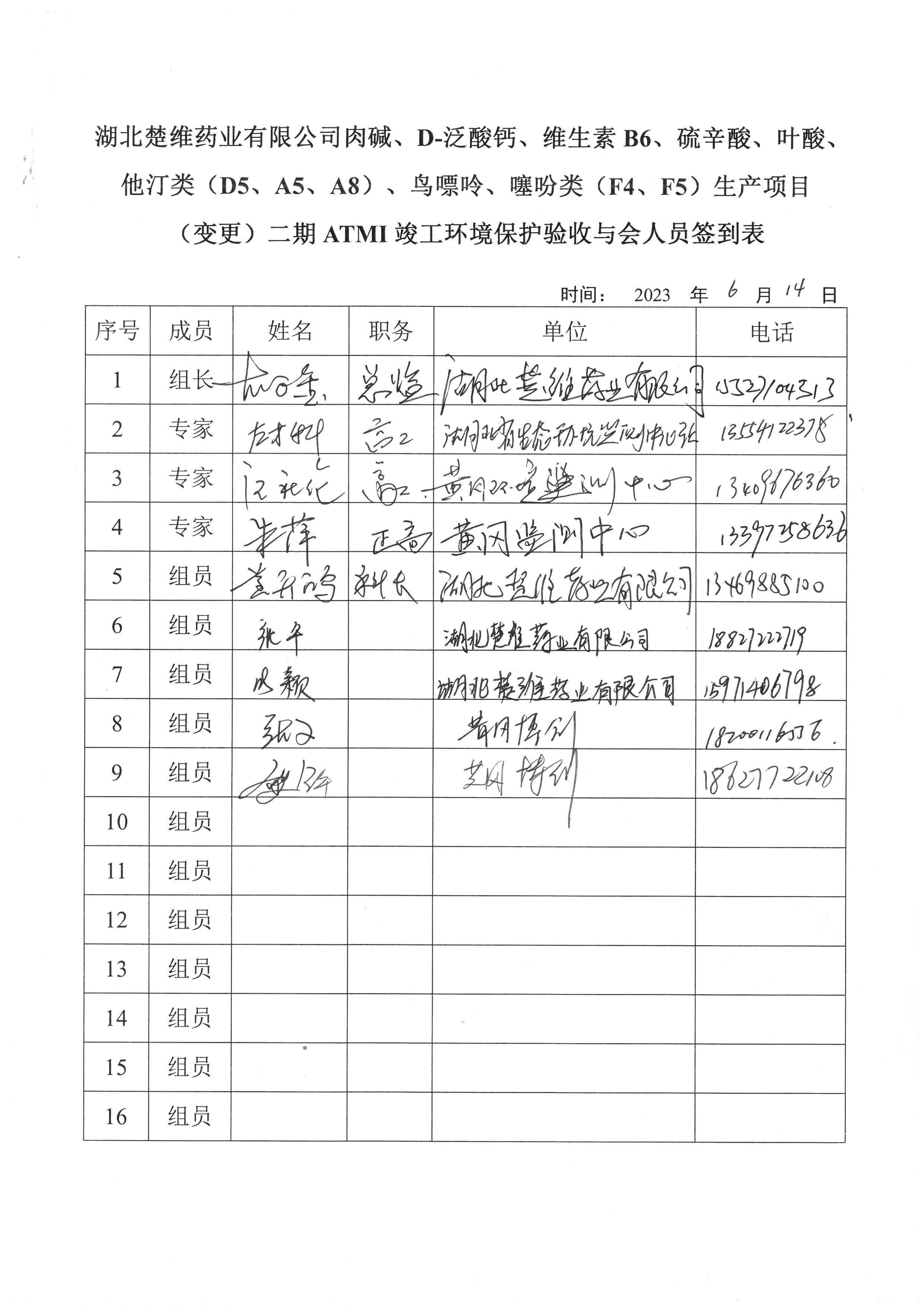2023年6月14日,湖北楚維藥業(yè)有限公司在黃岡市主持召開了《湖北楚維藥業(yè)有限公司肉堿、D-泛酸鈣、維生素B6、硫辛酸、葉酸、他汀類(D5、A5、A8)、鳥嘌呤、噻吩類(F4、F5)生產(chǎn)項目(變更)二期ATMI竣工環(huán)境保護驗收監(jiān)測報告》技術(shù)評估會。