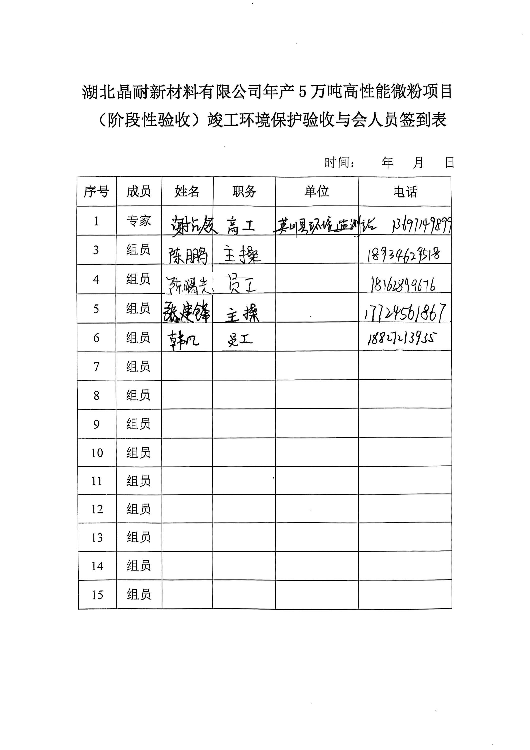 2025年4月19日,湖北晶耐新材料有限公司根據(jù)國(guó)家有關(guān)法律法規(guī)的要求,邀請(qǐng)1位專家負(fù)責(zé)對(duì)《湖北晶耐新材料有限公司年產(chǎn)5萬(wàn)噸高性能微粉項(xiàng)目(階段性驗(yàn)收)竣工環(huán)境保護(hù)驗(yàn)收監(jiān)測(cè)表》內(nèi)容術(shù)審查。